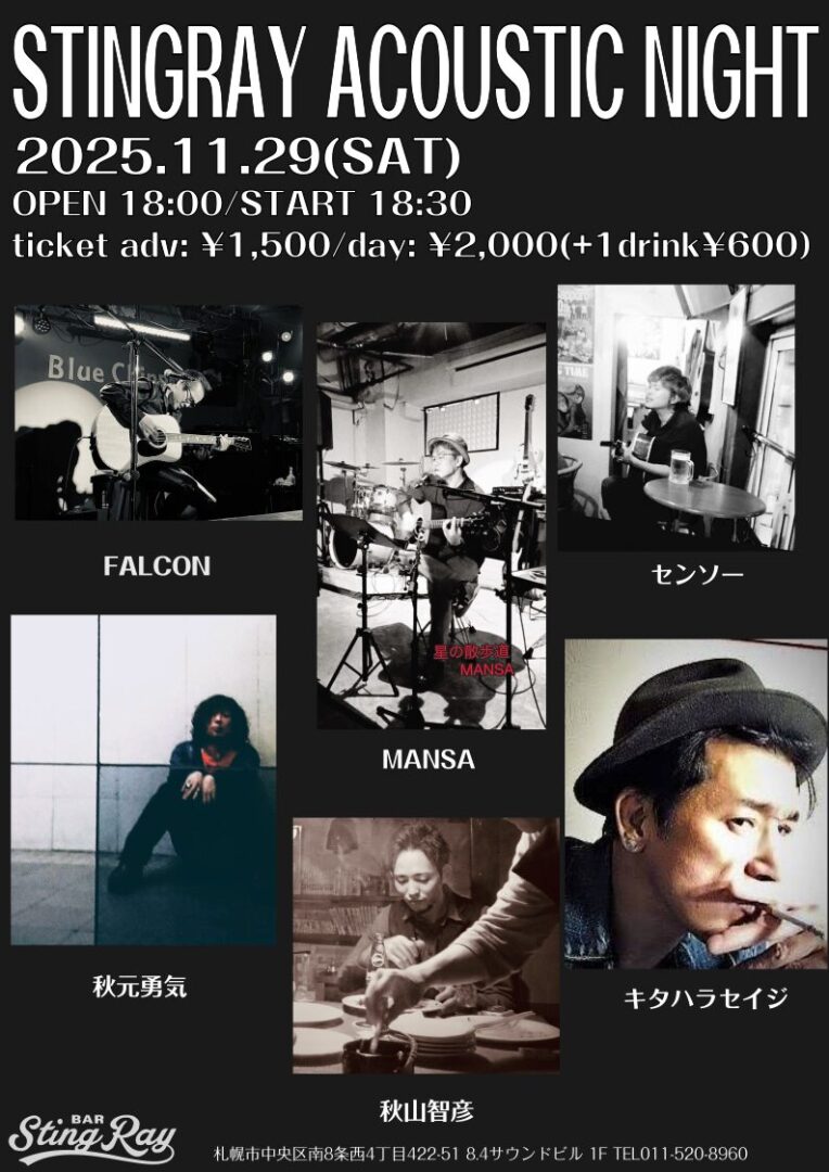 TITLE STINGRAY ACOUSTIC NIGHT ARTIS FALCON センソー キタハラセイジ 秋元勇気 秋山智彦 MANSA DATE 2025.11.29(SAT) : OPEN