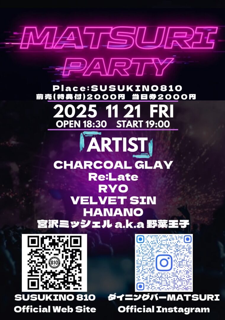 TITLE MATSURI PARTY ARTIST CHARCOAL GLAY Re:Late RYO VELVET SIN HANANO 宮沢ミッシェルa.k.a野菜王子 DATE 2025.11